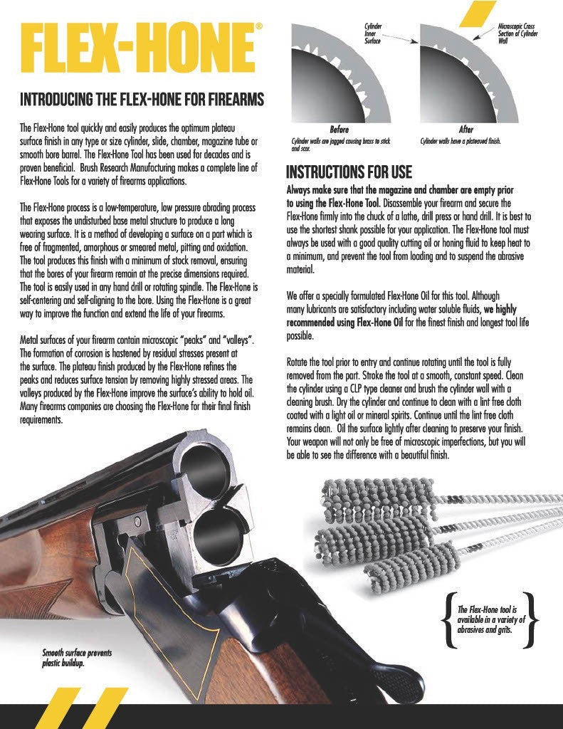 SPECS: Flex Hone ® for Barrels; 10, 12, 16, 20 ga., .410 bore. 33" (83.8cm) long in Med.-Coarse grit (red tip) or Fine grit (light blue tip). Flex Hone ® for Chambers; 10, 12, 16, 20 ga., .410 bore 12" (6.5cm) long, fine grit (light blue only). Set includes Med.-Coarse & Fine barrel hones, Chamber hone & 1 qt. Flex Hone ® oil, for 1 ga.